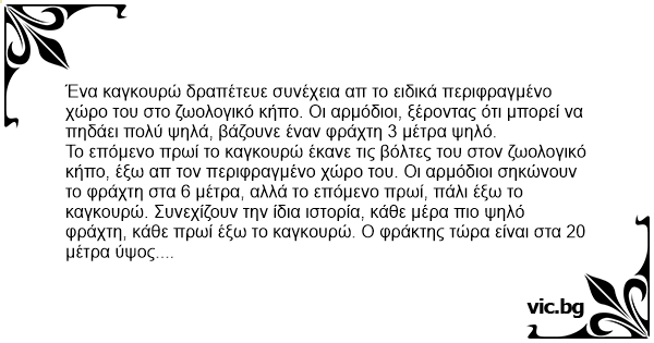 Το επόμενο πρωί το καγκουρώ έκανε τις βόλτες του στον ζωολογικό κήπο, έξω απ τον περιφραγμένο χώρο του. Οι αρμόδιοι σηκώνουν το φράχτη στα 6 μέτρα, αλλά το επόμενο πρωί, πάλι έξω το καγκουρώ. Συνεχίζουν την ίδια ιστορία, κάθε μέρα πιο ψηλό φράχτη, κάθε πρωί έξω το καγκουρώ. Ο φράκτης τώρα είναι στα 20 μέτρα ύψος.