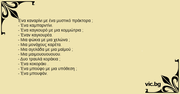 Ένα καναρίνι με ένα μυστικό πράκτορα ; - Ένα καμπαρντίνι. - Ένα καγκουρό με μια κομμώτρια ; - Έναν καγκουρέα. - Μια φώκια με μια χελώνα ; - Μια μονάχους καρέτα. - Μια αγελάδα με μια μαϊμού ; - Μια μαιμουουουουου. - Δυο τραυλά κοράκια ; - Ένα κοκοράκι . - Ένα μπούφο με μια υπόθεση ; - Ένα μπουφάν.