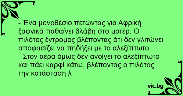 - Ένα μονοθέσιο πετώντας για Αφρική ξαφνικά παθαίνει βλάβη στο μοτέρ. Ο πιλότος έντρομος βλέποντας ότι δεν γλιτώνει αποφασίζει να πηδήξει με το αλεξίπτωτο.