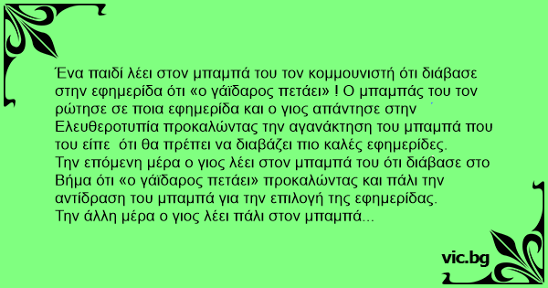 Ένα παιδί λέει στον μπαμπά του τον κομμουνιστή ότι διάβασε στην εφημερίδα ότι «ο γάϊδαρος πετάει» ! Ο μπαμπάς του τον ρώτησε σε ποια εφημερίδα και ο γιος απάντησε στην Ελευθεροτυπία προκαλώντας την αγανάκτηση του μπαμπά που του είπε ότι θα πρέπει να διαβάζει πιο καλές εφημερίδες.