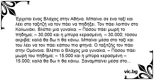 Έρχεται ένας Βλάχος στην Αθήνα. Μπαίνει σε ένα ταξί και λέει στο ταξιτζή να τον πάει να πηδήξει. Τον πάει λοιπόν στο Κολωνάκι. Βλέπει μια γυναίκα. – Πόσου πάει μωρή το πήδημα; – 30.000 και η μπύρα κερασμένη. – 30.000; τόσου ακριβά; καλά θα δω τι θα κάνω. Μπαίνει μέσα στο ταξί και του λέει να τον πάει κάπου πιο φτηνά. Ο ταξιτζής τον πάει στην Ομόνοια. Βλέπει ο Βλάχος μια γυναίκα. – Πόσου πάει μωρή του πήδημα; – 15.000 και η μπύρα κερασμένη – 15.000; καλά θα δω τι θα κάνω. Ξαναμπαίνει μέσα στο ταξί και του λέει να τον πάει κάπου ακόμα πιο φτηνά. – Θα σε φτιάξω καλά τώρα. Μουρμούριζε εκείνος και τον πάει στη Συγγρού. Βλέπει ο Βλάχος μια τραβεστί αλλά φυσικά την περνάει για γυναίκα. – Πόσου πάει μωρή του πήδημα; 5.000 και η μπύρα κερασμένη. 5.000; μόνο; πάμε! Πραγματικά πάνε στο ξενοδοχείο. Η τραβεστί κατάλαβε ότι ο Βλάχος τη νόμιζε κανονική γυναίκα και σκεφτόταν πως να του το πει. – Ωραίος καιρός σήμερα! – Μωρή άντε γδύσου εκεί να τελειώνουμε! – θα του το πω χύμα και ότι γίνει. Σκέφτηκε Ξέρεις. Δεν έχω. Κλειτορίδα. Του λέει – Ε! φέρε μια heineken! Εκεί θα κολλήσουμε τώρα;
