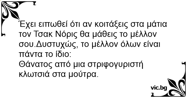 Έχει ειπωθεί ότι αν κοιτάξεις στα μάτια τον Τσακ Νόρις θα μάθεις το μέλλον σου.Δυστυχώς, το μέλλον όλων είναι πάντα το ίδιο: