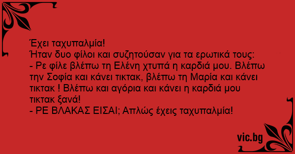 - Ρε φίλε βλέπω τη Ελένη χτυπά η καρδιά μου. Βλέπω την Σοφία και κάνει τικτακ, βλέπω τη Μαρία και κάνει τικτακ ! Βλέπω και αγόρια και κάνει η καρδιά μου τικτακ ξανά!