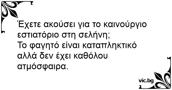 Американски астронавт пред комисия на НАСА по повод изпращането на китайски космонавт в космоса. Чухте ли? NASA открива ресторант на Луната. Казват, че менюто е отлично, но му липсвала атмосфера. 2030 година. НАСА открива първия в историята ресторант на Луната. Един от посетителите пише в книгата за гости: Did you hear about the psychic amnesiac? He knew in advance what he was going to forget. Did you hear about the new restaurant that just opened up on the moon? Great food, but no atmosphere. Did you hear about the restaurant on the moon? I heard the food was good but it had no atmosphere.. Har du hørt om restauranten på månen?– God mad, ingen atmosfære. Did you hear about the new restaurant on the moon? Great food but no atmosphere. Due astronauti mangiano in un ristorante sulla luna. Uno dice: “Guarda, non è incredibile? Eccoci qui, che mangiamo in un ristorante sulla luna! Che te ne pare?”. “Si’, è carino, e il cibo è... - Har du hört att de har öppnat en restaurang på månen? - Nej, hur är den? - Maten är bra, men det är ingen atmosfär. Trwa ostra imprezka na Księżycu. W pewnej chwili ktoś mówi: - Wiesz co, Armstrong. Niby wszystko się zgadza... Rozpaliliśmy grilla, jest wódeczka, są kobitki, a jakoś atmosfery nie ma. Rzecz dzieje się na Księżycu. Amerykanie wysiedli z lądownika i powoli rozkręcają imprezę. Rozpalili grilla, wyciągnęli piwo, puścili muzyczkę - wiadomo. Wtem Armstrong odzywa się do... Hvilke anmeldelser får restauranten der ligger på månen altid? -  4 stjerner. Der er god mad, men slet ingen atmosfære Why did the restaurant on the moon get bad reviews? It has no atmosphere.
