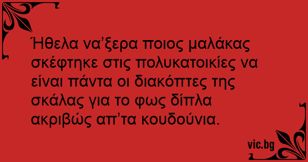 Ήθελα να’ξερα ποιος μαλάκας σκέφτηκε στις πολυκατοικίες να είναι πάντα οι διακόπτες της σκάλας για το φως δίπλα ακριβώς απ’τα κουδούνια.