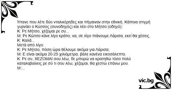 Ήτανε που λέτε δύο νταλικέρηδες και πήγαιναν στην εθνική. Κάποια στιγμή γυρνάει ο Κώτσος (συνοδηγός) και λέει στο Μήτσο (οδηγό):