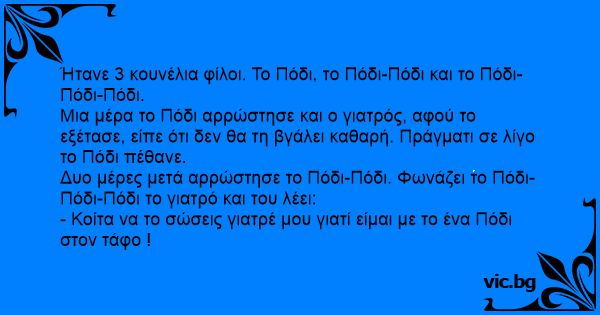 Δυο μέρες μετά αρρώστησε το Πόδι-Πόδι. Φωνάζει το Πόδι-Πόδι-Πόδι το γιατρό και του λέει: