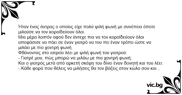 Μια μέρα λοιπόν αφού δεν άντεχε πια να τον κοροϊδεύουν όλοι αποφάσισε να πάει σε έναν γιατρό να του πει έναν τρόπο ώστε να μιλάει με πιο χοντρή φωνή.