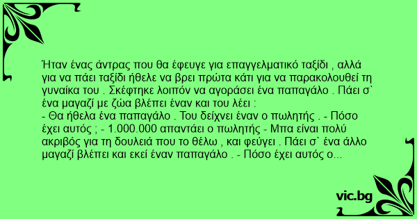 Ήταν ένας άντρας που θα έφευγε για επαγγελματικό ταξίδι , αλλά για να πάει ταξίδι ήθελε να βρει πρώτα κάτι για να παρακολουθεί τη γυναίκα του . Σκέφτηκε λοιπόν να αγοράσει ένα παπαγάλο . Πάει σ` ένα μαγαζί με ζώα βλέπει έναν και του λέει :