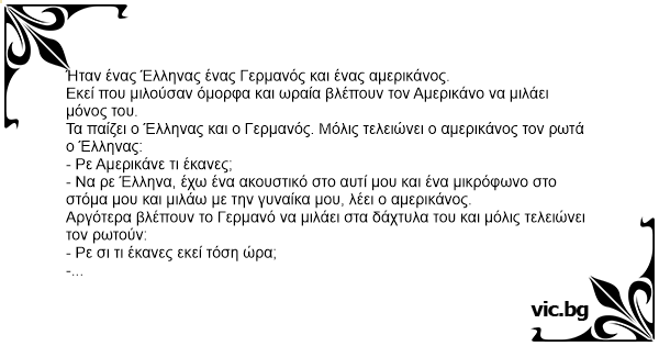 Τα παίζει ο Έλληνας και ο Γερμανός. Μόλις τελειώνει ο αμερικάνος τον ρωτά ο Έλληνας: