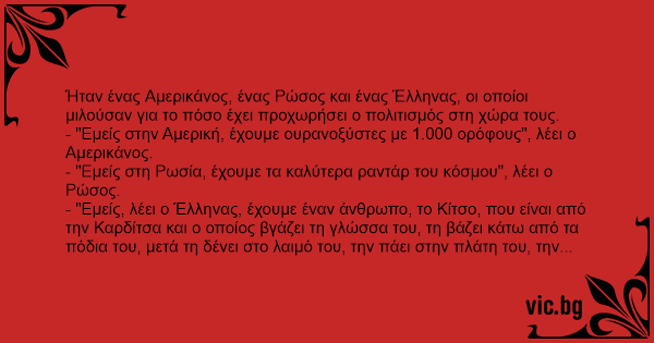 Ήταν ένας Αμερικάνος, ένας Ρώσος και ένας Έλληνας, οι οποίοι μιλούσαν για το πόσο έχει προχωρήσει ο πολιτισμός στη χώρα τους.