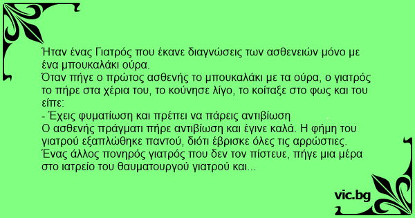 Όταν πήγε ο πρώτος ασθενής το μπουκαλάκι με τα ούρα, ο γιατρός το πήρε στα χέρια του, το κούνησε λίγο, το κοίταξε στο φως και του είπε: