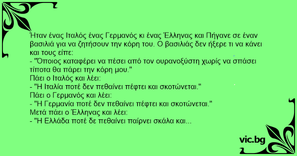 Ήταν ένας Ιταλός ένας Γερμανός κι ένας Έλληνας και Πήγανε σε έναν βασιλιά για να ζητήσουν την κόρη του. Ο βασιλιάς δεν ήξερε τι να κάνει και τους είπε: