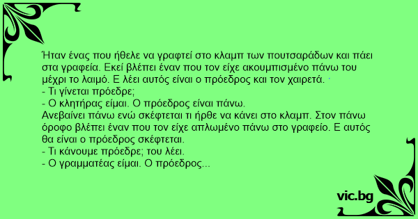 Ήταν ένας που ήθελε να γραφτεί στο κλαμπ των πουτσαράδων και πάει στα γραφεία. Εκεί βλέπει έναν που τον είχε ακουμπισμένο πάνω του μέχρι το λαιμό. Ε λέει αυτός είναι ο πρόεδρος και τον χαιρετά.