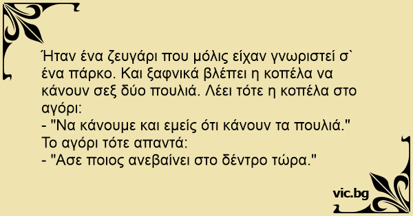 Ήταν ένα ζευγάρι που μόλις είχαν γνωριστεί σ` ένα πάρκο. Και ξαφνικά βλέπει η κοπέλα να κάνουν σεξ δύο πουλιά. Λέει τότε η κοπέλα στο αγόρι: