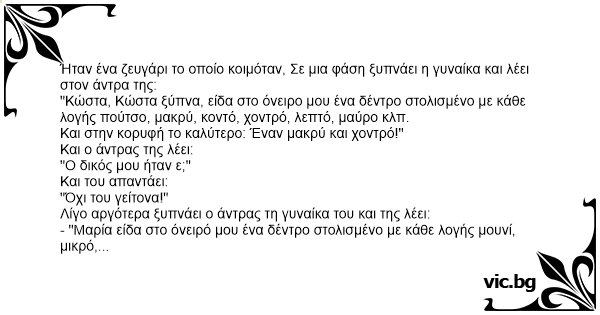 "Κώστα, Κώστα ξύπνα, είδα στο όνειρο μου ένα δέντρο στολισμένο με κάθε λογής πούτσο, μακρύ, κοντό, χοντρό, λεπτό, μαύρο κλπ.