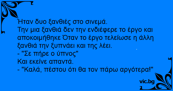 Την μια ξανθιά δεν την ενδιέφερε το έργο και αποκοιμήθηκε Όταν το έργο τελείωσε η άλλη ξανθιά την ξυπνάει και της λέει.