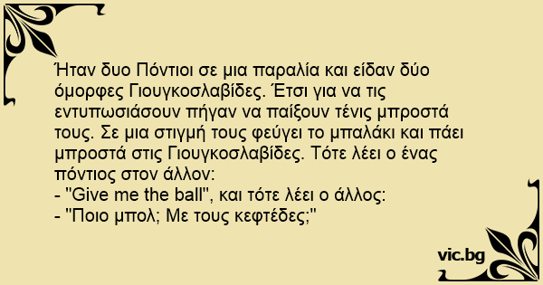 Ήταν δυο Πόντιοι σε μια παραλία και είδαν δύο όμορφες Γιουγκοσλαβίδες. Έτσι για να τις εντυπωσιάσουν πήγαν να παίξουν τένις μπροστά τους. Σε μια στιγμή τους φεύγει το μπαλάκι και πάει μπροστά στις Γιουγκοσλαβίδες. Τότε λέει ο ένας πόντιος στον άλλον: