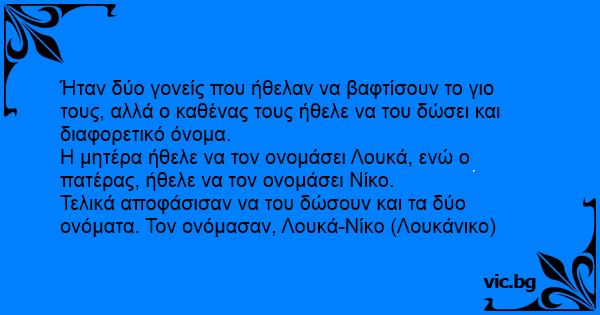 Τελικά αποφάσισαν να του δώσουν και τα δύο ονόματα. Τον ονόμασαν, Λουκά-Νίκο (Λουκάνικο)