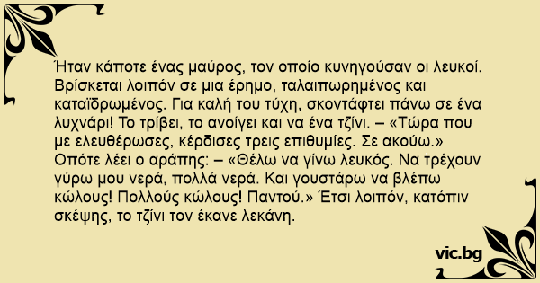 Ήταν κάποτε ένας μαύρος, τον οποίο κυνηγούσαν οι λευκοί. Βρίσκεται λοιπόν σε μια έρημο, ταλαιπωρημένος και καταϊδρωμένος. Για καλή του τύχη, σκοντάφτει πάνω σε ένα λυχνάρι! Το τρίβει, το ανοίγει και να ένα τζίνι. – «Τώρα που με ελευθέρωσες, κέρδισες τρεις επιθυμίες. Σε ακούω.» Οπότε λέει ο αράπης: – «Θέλω να γίνω λευκός. Να τρέχουν γύρω μου νερά, πολλά νερά. Και γουστάρω να βλέπω κώλους! Πολλούς κώλους! Παντού.» Έτσι λοιπόν, κατόπιν σκέψης, το τζίνι τον έκανε λεκάνη.