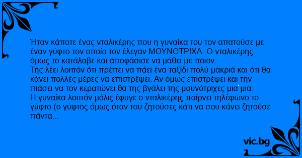 Ήταν κάποτε ένας νταλικέρης που η γυναίκα του τον απατούσε με έναν γύφτο τον οποίο τον έλεγαν ΜΟΥΝΟΤΡΙΧΑ. Ο νταλικέρης όμως το κατάλαβε και αποφάσισε να μάθει με ποιον.