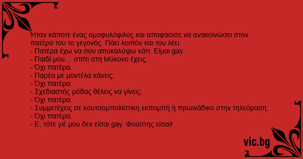 Ήταν κάποτε ένας ομοφυλόφιλος και αποφάσισε να ανακοινώσει στον πατέρα του το γεγονός. Πάει λοιπόν και του λέει: