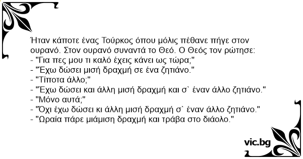 Ήταν κάποτε ένας Τούρκος όπου μόλις πέθανε πήγε στον ουρανό. Στον ουρανό συναντά το Θεό. Ο Θεός τον ρώτησε: