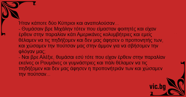 - Θυμάσαιν βρε Μιχάλην τότεν που είμασταν φοιτητές και είχαν έρθειν στην παραλίαν κάτι Αμερικάνες κολυμβήτριες και εμείς θέλαμεν να τις πηδήξομεν και δεν μας άφησεν ο προπονητής των, και χώσαμεν την πούτσαν μας στην άμμον για να σβήσομεν την φλόγαν μας;