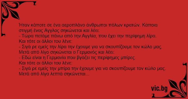 Ήταν κάποτε σε ένα αεροπλάνο άνθρωποι πόλων κρατών. Κάποια στιγμή ένας Αγγλος σηκώνεται και λέει: