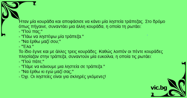 Ήταν μία κουράδα και αποφάσισε να κάνει μία ληστεία τράπεζας. Στο δρόμο όπως πήγαινε, συναντάει μια άλλη κουράδα, η οποία τη ρωτάει: