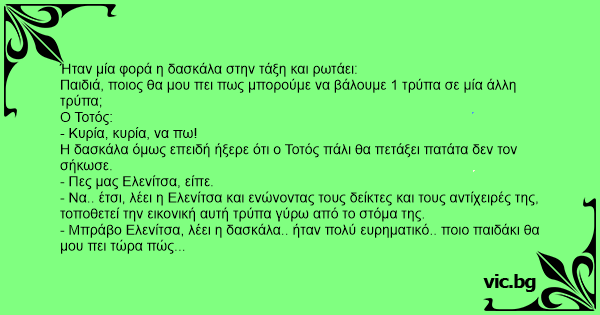 - Μπράβο Ελενίτσα, λέει η δασκάλα.. ήταν πολύ ευρηματικό.. ποιο παιδάκι θα μου πει τώρα πώς να βάλουμε δύο τρύπες σε μια τρύπα;