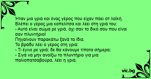 Ήταν μια γριά και ένας γέρος που είχαν πάει στ λαϊκή. Βλέπει ο γέρος μια κοπελίτσα και λέει στη γριά του: