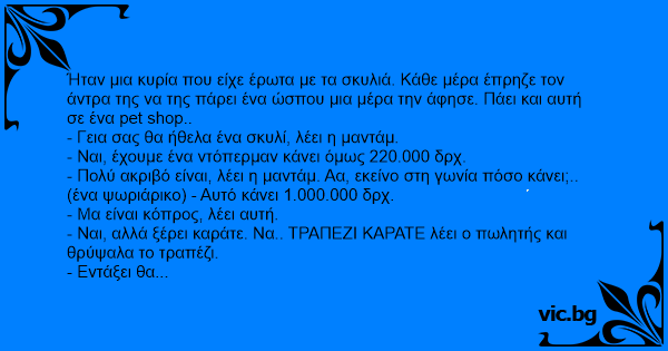 Ήταν μια κυρία που είχε έρωτα με τα σκυλιά. Κάθε μέρα έπρηζε τον άντρα της να της πάρει ένα ώσπου μια μέρα την άφησε. Πάει και αυτή σε ένα pet shop..