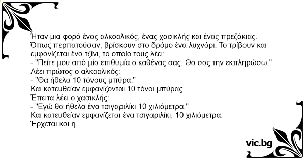 Ήταν μια φορά ένας αλκοολικός, ένας χασικλής και ένας πρεζάκιας. Όπως περπατούσαν, βρίσκουν στο δρόμο ένα λυχνάρι. Το τρίβουν και εμφανίζεται ένα τζίνι, το οποίο τους λέει: