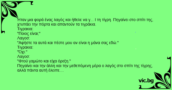 Ήταν μια φορά ένας λαγός και ήθελε να γ... Ι τη τίγρη. Πηγαίνει στο σπίτι της, χτυπάει την πόρτα και απαντούν τα τιγράκια.