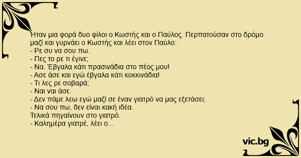 - Κωστής: Γιατρέ ο φίλος μου και εγώ έχουμε ένα σοβαρό πρόβλημα. Εγώ έχω κάτι κοκκιναδια στο πέος μου και αυτός έχει κάτι πρασινάδια. Τι να κάνουμε γιατρέ;