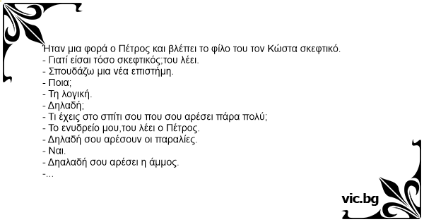 - Γεια σου ρε Γιώργο. Τώρα συνάντησα τον Κώστα και μου έμαθε μια νέα επιστήμη,τη λογική. Θες να στη δείξω;