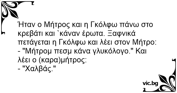 Ήταν ο Μήτρος και η Γκόλφω πάνω στο κρεβάτι και `κάναν έρωτα. Ξαφνικά πετάγεται η Γκόλφω και λέει στον Μήτρο: