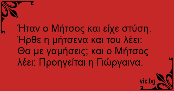 Ήταν ο Μήτσος και είχε στύση. Ήρθε η μήτσενα και του λέει: Θα με γαμήσεις; και ο Μήτσος λέει: Προηγείται η Γιώργαινα.