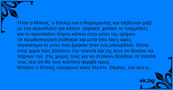 Ήταν ο Μπους, ο Μπλέρ και ο Καραμανλής και ταξίδευαν μαζί με ένα αεροπλάνο για κάπου. ξαφνικά. χαλάνε οι τουρμπίνες και το αεροπλάνο πέφτει κάπου στην μέση της ερήμου.
