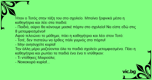 Ήταν ο Τοτός στην τάξη του στο σχολείο. Μπαίνει ξαφνικά μέσα η καθηγήτρια και λέει στα παιδιά: