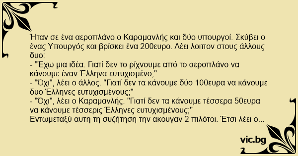 Ήταν σε ένα αεροπλάνο ο Καραμανλής και δύο υπουργοί. Σκύβει ο ένας Υπουργός και βρίσκει ένα 200ευρο. Λέει λοιπον στους άλλους δυο: