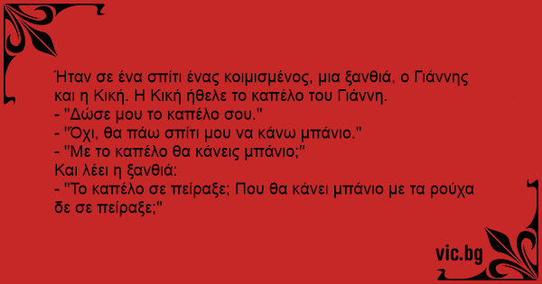 Ήταν σε ένα σπίτι ένας κοιμισμένος, μια ξανθιά, ο Γιάννης και η Κική. Η Κική ήθελε το καπέλο του Γιάννη.