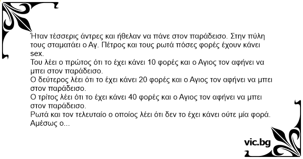 Ήταν τέσσερις άντρες και ήθελαν να πάνε στον παράδεισο. Στην πύλη τους σταματάει ο Αγ. Πέτρος και τους ρωτά πόσες φορές έχουν κάνει sеx.