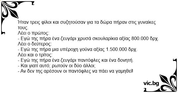 Ήταν τρεις φίλοι και συζητούσαν για τα δώρα πήραν στις γυναίκες τους.
