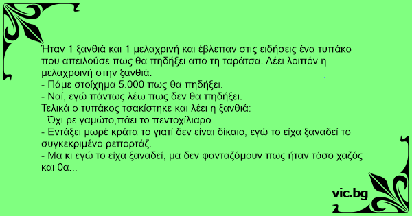 Ήταν 1 ξανθιά και 1 μελαχρινή και έβλεπαν στις ειδήσεις ένα τυπάκο που απειλούσε πως θα πηδήξει απο τη ταράτσα. Λέει λοιπόν η μελαχροινή στην ξανθιά:
