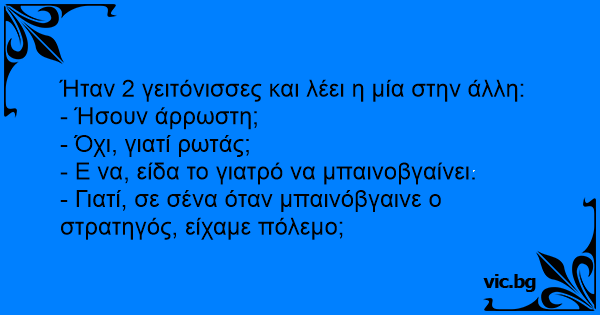 Болна Две комшийки на село си говорят през оградата и едната вика: Spotykają się dwie nieprzepadające ze sobą sąsiadki: - A cóż to, źle się pani dziś czuła, pani Kowalska? -pyta jedna z nich. Chorowała pani w nocy? - Skąd to pani przyszło do głowy? - odparskuje... Conversa entre vizinhas: — Petra, você está doente? Pergunto porque vi sair um médico de sua casa hoje de manhã. — Olha lá! Ontem de manhã eu vi sair um coronel da sua casa e não estamos em guerra. Dos mujeres están conversando y una le dice a la otra. - ¿Y tú, no estabas enferma? - ¿Por qué? - Porque yo vi salir ayer a un médico de tu casa. - Eso no es nada. - ¿Por qué? - Porque yo vi salir... To nabodamer snakket sammen over hekken: – Kjære, er du syk? – Hvorfor tror du det? – Jeg så en lege som gikk av huset ditt i dag. – Så når jeg så at det gikk en general ut av huset ditt, betyr det... Una vecina le dice a otra: - ¿Consuelo, no estabas enferma? Consuelo dice: - ¿Por qué lo dices? - Pero Consuelo, si vi salir un médico de tu casa. - Eso no es nada, porque yo vi salir un general... - Carmen, ¿estás enferma? Te lo pregunto porque vi salir a un médico de tu casa, esta mañana. - Mirá, ayer por la mañana yo vi salir a un militar de la tuya, y no estamos en guerra. Δύο γειτόνισσες συναντιούνται στην λαϊκή. - Καλημέρα Μαρία μου. Τις τελευταίες μέρες παρατήρησα τον γιατρό, άθελά μου, να μπαινοβγαίνει στο σπίτι σου. Ήσουν άρρωστη; - Γιατί Ελένη μου; Σε σένα που...