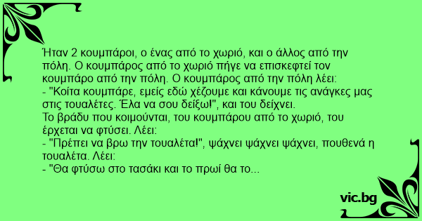 Ήταν 2 κουμπάροι, ο ένας από το χωριό, και ο άλλος από την πόλη. Ο κουμπάρος από το χωριό πήγε να επισκεφτεί τον κουμπάρο από την πόλη. Ο κουμπάρος από την πόλη λέει: