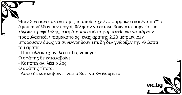 Ήταν 3 ναυαγοί σε ένα νησί, το οποίο είχε ένα φαρμακείο και ένα πο**ίο. Αφού συνήλθαν οι ναυαγοί, θέλησαν να εκτονωθούν στο πορνείο. Για λόγους προφύλαξης, σταμάτησαν από το φαρμακείο για να πάρουν προφυλακτικά. Φαρμακοποιός, ένας αράπης 2.20 μέτρων. Δεν μπορούσαν όμως να συνεννοηθούν επειδή δεν γνώριζαν την γλώσσα του αράπη.