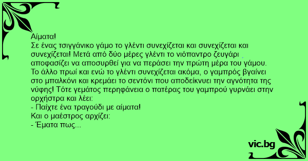 Σε ένας τσιγγάνικο γάμο το γλέντι συνεχίζεται και συνεχίζεται και συνεχίζεται! Μετά από δύο μέρες γλέντι το νιόπαντρο ζευγάρι αποφασίζει να αποσυρθεί για να περάσει την πρώτη μέρα του γάμου. Το άλλο πρωί και ενώ το γλέντι συνεχίζεται ακόμα, ο γαμπρός βγαίνει στο μπαλκόνι και κρεμάει το σεντόνι που αποδείκνυει την αγνότητα της νύφης! Τότε γεμάτος περηφάνεια ο πατέρας του γαμπρού γυρνάει στην ορχήστρα και λέει: